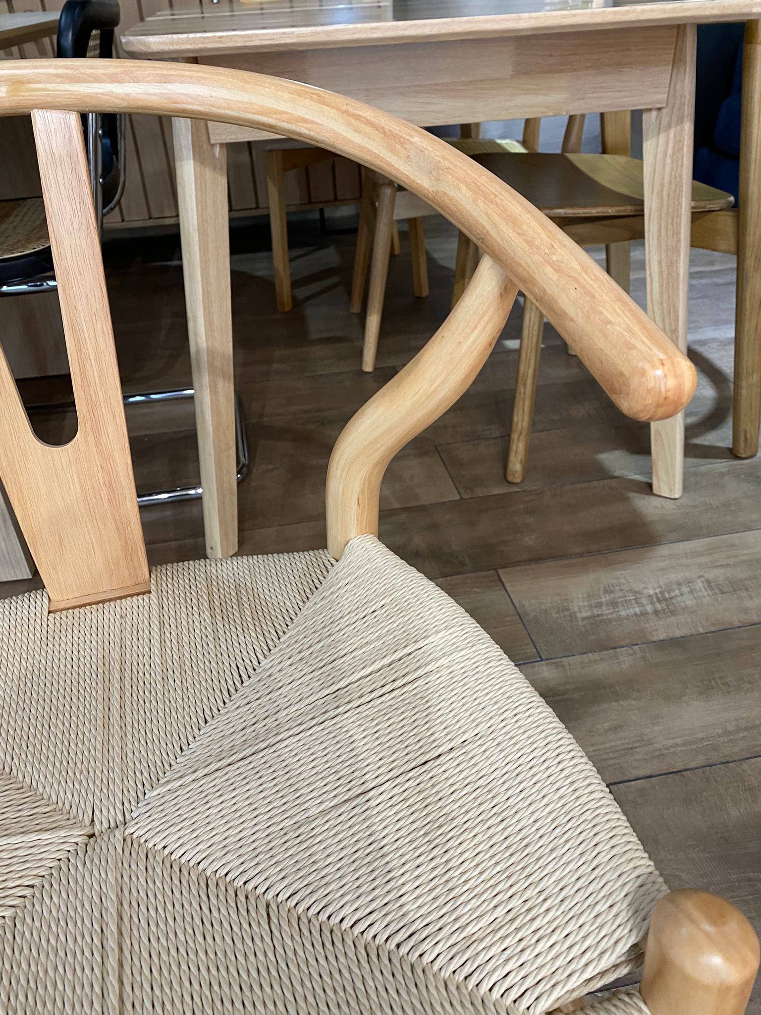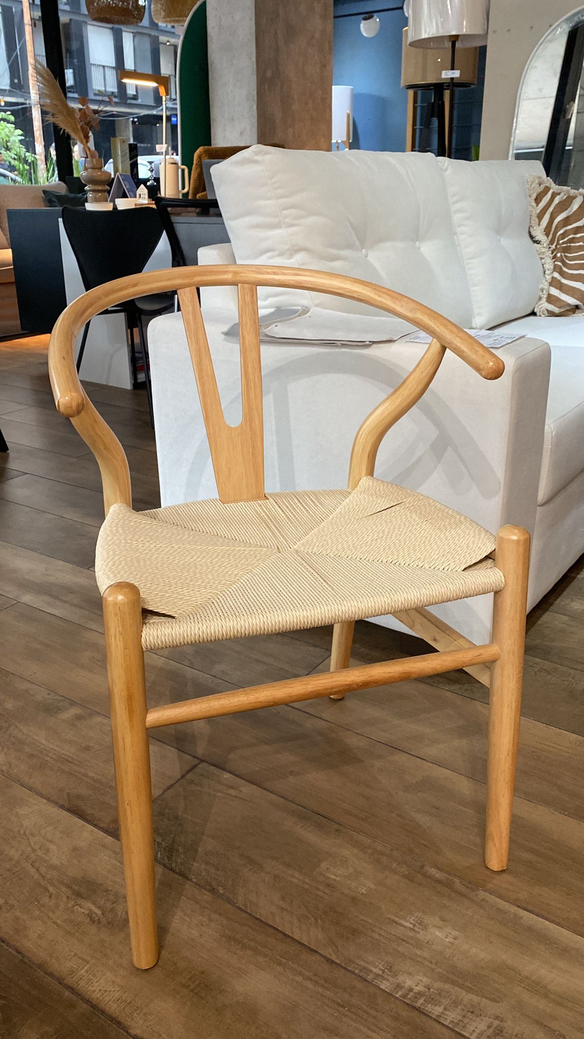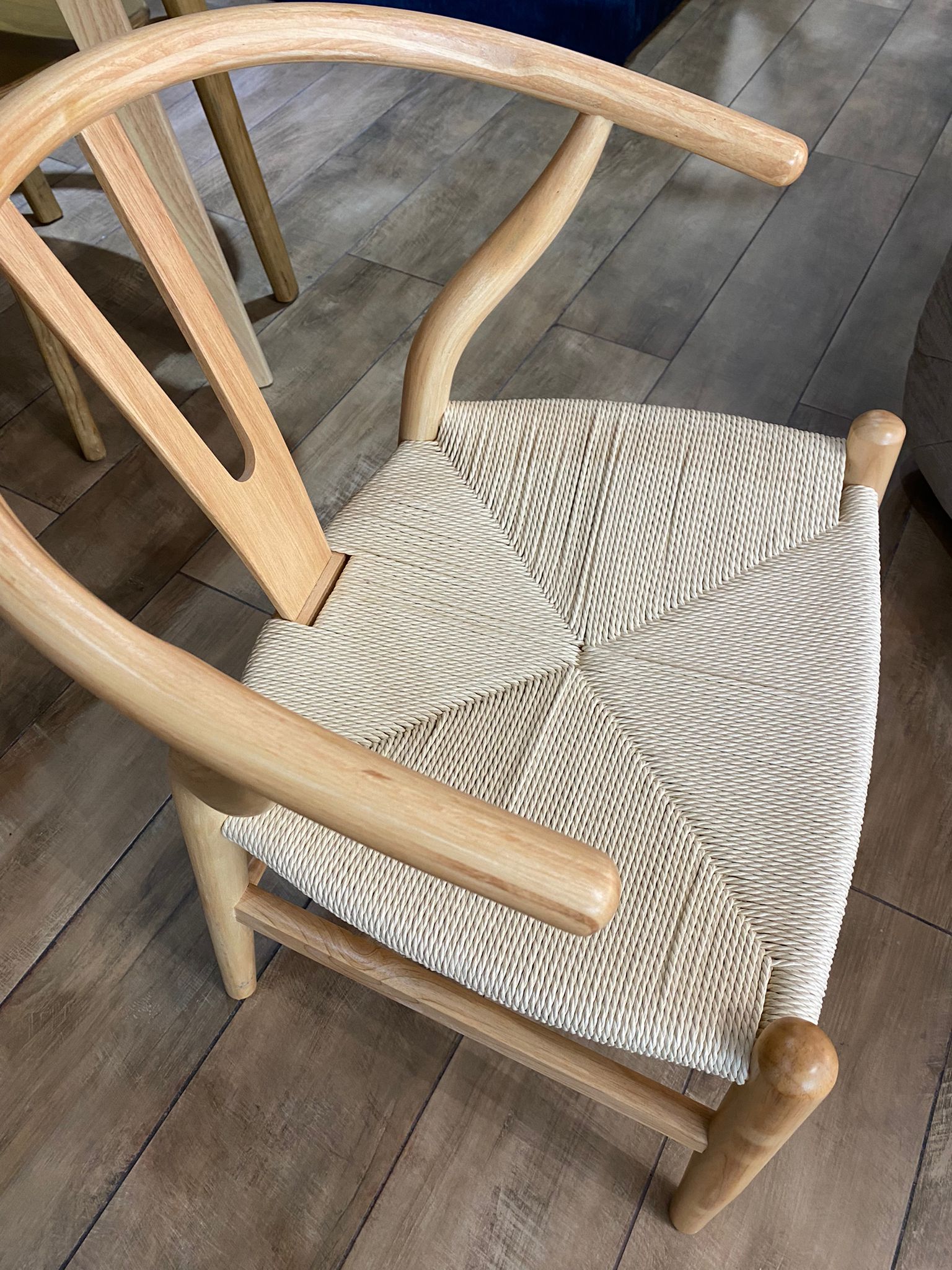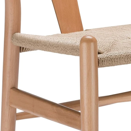 Silla Wishbone en madera maciza de haya color natural, con asiento trenzado en fibras naturales